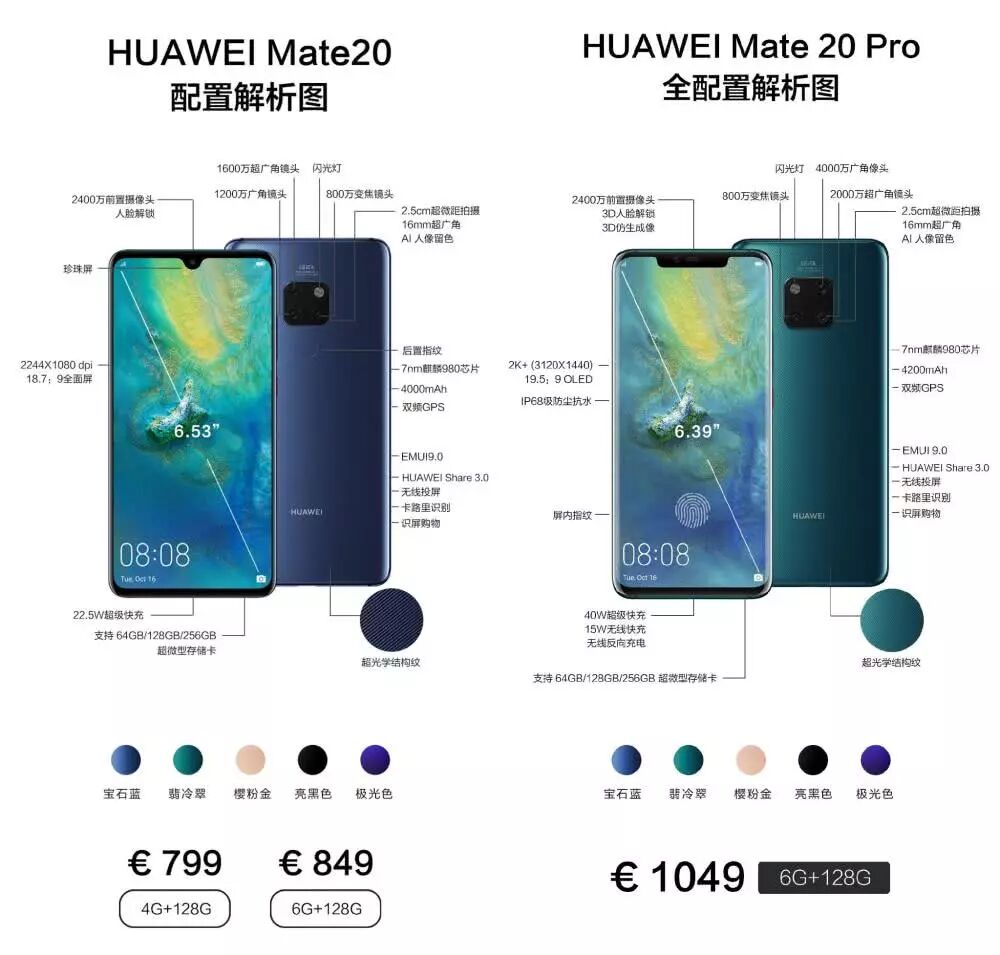 Mate 20采用了6.53英寸LCD屏幕,分辨率2244x1080,后置指纹传感器。它的后置三摄像头分别是1200万(广角)+1600万(超广角)+800万(长焦)像素,电池容量4000mAh,支持22.5W超级快充,存储容量有6+64GB和6+128GB可选,售价788/849欧元,国行价格据传是4199 / 4699元。