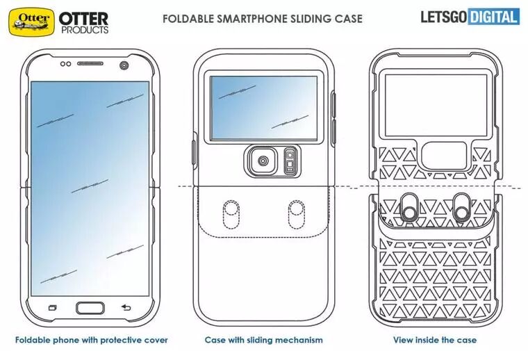通过专利内容可以发现,或许是考虑到已出现的折叠屏手机专利中的各种折叠方式,OtterBox公司所设计的外壳样式比较全面。包含使用铰链折叠屏幕的手机外壳、使用柔性(可拉伸)材料折叠屏幕的手机外壳以及一种可扩展的手机外壳,第三种外壳在折叠智能手机时外壳底部会向下滑动,在完全折叠后,设备外壳会完全闭合。这种设计曾出现在三星曝光的一款折叠屏手机专利上。